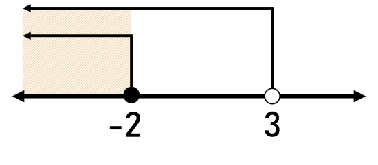 Jadi, daerah yang diarsir pada garis bilangan tersebut menunjukkan penyelesaian dari dua pertidaksamaan linear, yaitu $x \le -2$ dan $x < 3.$
