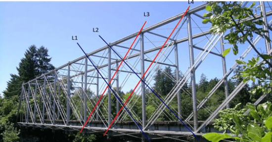 Bagian rangka jembatan tersebut dapat digambarkan dengan sketsa garis seperti berikut.