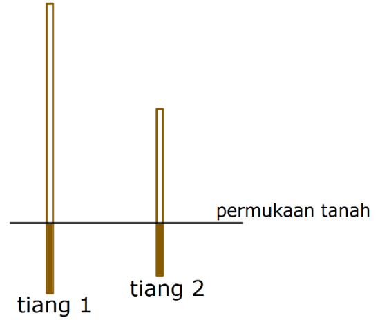 Pada tiang 1, bagian yang terlihat di atas tanah adalah $5$ kali panjang bagian yang tertanam di dalam tanah. Sementara itu, pada tiang 2, bagian yang terlihat di atas tanah adalah $3$ kali bagian yang tertanam. Diketahui jumlah panjang kedua tiang adalah $13$ meter dan jumlah panjang bagian tiang yang tertanam adalah $2,\!5$ meter.